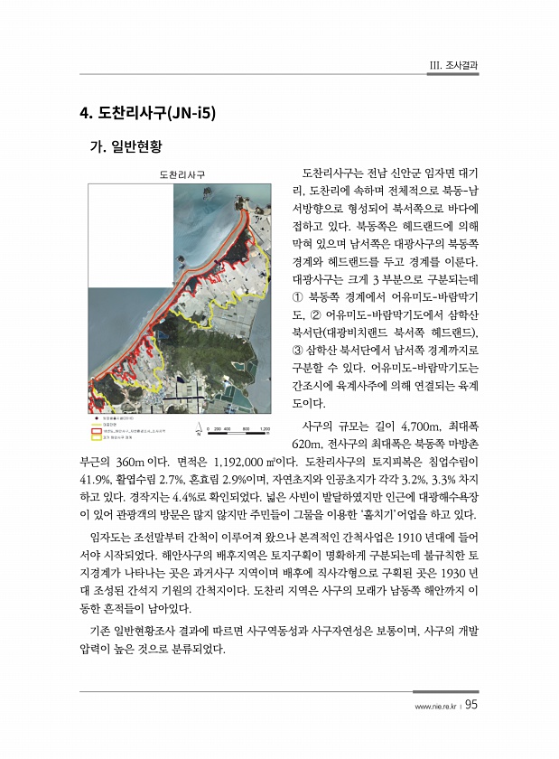 III. 조사결과 www.nie.re.kr ? 95 4. JN-i5 도찬리사구는 전남 신안군 임자면 대기 리, 도찬리에 속하며 전체적으로 북동-남 서방향으로 형성되어 북서쪽으로 바다에 접하고 있다. 북동쪽은 헤드랜드에 의해 막혀 있으며 남서쪽은 대광사구의 북동쪽 경계와 헤드랜드를 두고 경계를 이룬다. 대광사구는 크게 3 부분으로 구분되는데 ? 북동쪽 경계에서 어유미도-바람막기 도, ? 어유미도-바람막기도에서 삼학산 북서단 대광비치랜드 북서쪽 헤드랜드 , ? 삼학산 북서단에서 남서쪽 경계까지로 구분할 수 있다. 어유미도-바람막기도는 간조시에 육계사주에 의해 연결되는 육계 도이다. 사구의 규모는 길이 4,700m, 최대폭 620m, 전사구의 최대폭은 북동쪽 마방촌 부근의 360m 이다. 면적은 1,192,000...