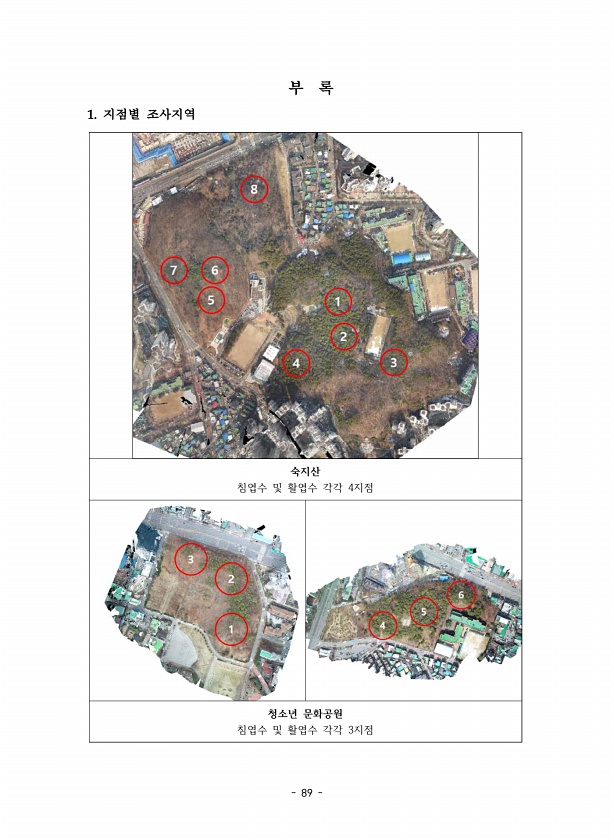 89 부 록 1. 지점별 조사지역 숙지산 침엽수 및 활엽수 각각 4지점 청소년 문화공원 침엽수 및 활엽수 각각3지점