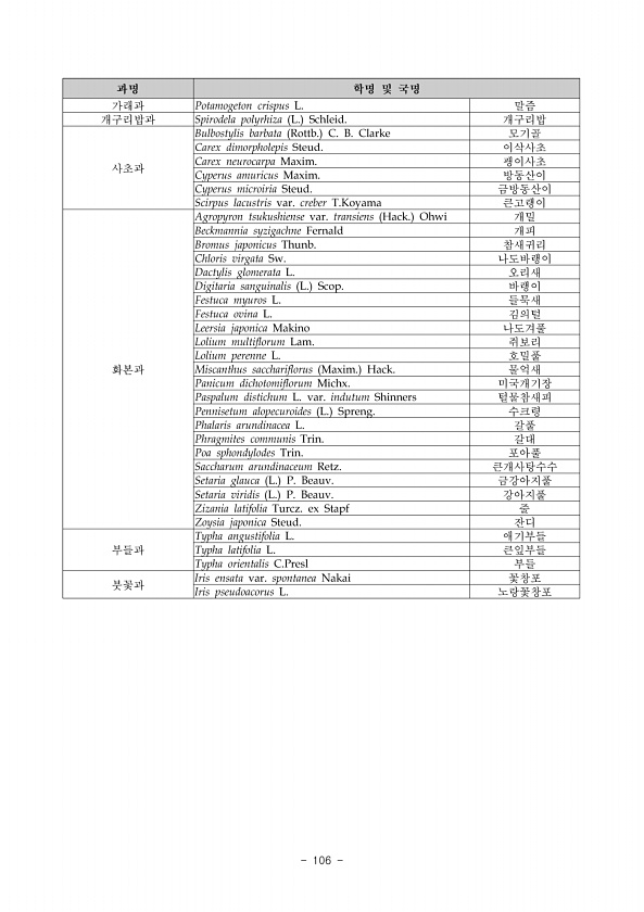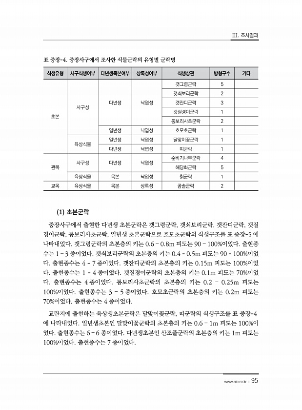III. 조사결과 www.nie.re.kr ? 95 식생유형 사구식생여부 다년생목본여부 상록성여부 식생상관 방형구수 기타 초본 사구성 다년생 낙엽성 갯그령군락 5 갯쇠보리군락 2 갯잔디군락 3 갯질경이군락 1 통보리사초군락 2 일년생 낙엽성 호모초군락 1 육상식물 일년생 낙엽성 달맞이꽃군락 1 다년생 낙엽성 띠군락 1 관목 사구성 다년생 낙엽성 순비기나무군락 4 해당화군락 5 육상식물 목본 낙엽성 칡군락 1 교목 육상식물 목본 상록성 곰솔군락 2 표 중장-4. 중장사구에서 조사한 식물군락의 유형별 군락명 1 중장사구에서 출현한 다년생 초본군락은 갯그령군락, 갯쇠보리군락, 갯잔디군락, 갯질 경이군락, 통보리사초군락, 일년생 초본군락으로 호모초군락의 식생구조를 표 중장-5 에 나타내었다. 갯그령군락의 초본층의 ...