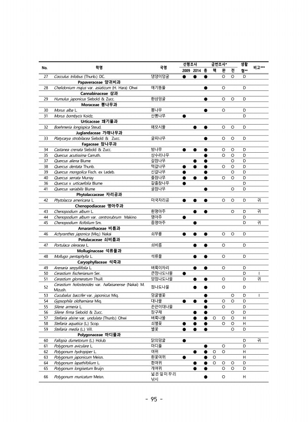 95 No. 학명 국명 선행조사 금번조사* 생활 2009 2014 총 핵 완 전 형** 비고*** 27 Cocculus trilobus Thunb. DC. 댕댕이덩굴 ● ● ● O O D Papaveraceae 양귀비과 28 Chelidonium majus var. asiaticum H. Hara Ohwi 애기똥풀 ● O D Cannabinaceae 삼과 29 Humulus japonicus Siebold & Zucc. 환삼덩굴 ● O O D Moraceae 뽕나무과 30 Morus alba L. 뽕나무 ● O D 31 Morus bombycis Koidz. 산뽕나무 ● D Urticaceae 쐐기풀과 32 Boehmeria longispica Steud. 왜모시풀 ● ● O O D Juglandaceae ...
