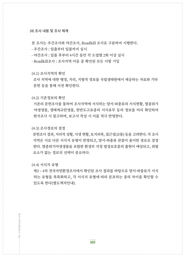 4 조사?내용?및?조사?체계 본?조사는?주간조사와?야간조사, Roadkill 조사로?구분하여?시행한다. 주간조사 일출부터?일몰까지?실시 야간조사 일몰?후부터 ?시간?동안?각?도엽별 ?회?이상?실시 Roadkill조사 조사지역?이동?중?확인된?모든?사항?기입 ?.? 조사지역의?확인 조사?지역에?대한?행정, 지리, 지형적?정보를?국립생태원에서?제공하는?자료와?기타 문헌?등을?통해?사전?확인한다. ?.? 기존정보의?확인 기존의?문헌조사를?통하여?조사지역에?서식하는?양서·파충류의?서식현황, 멸종위기 야생생물, 생태계교란생물, 한반도고유종의?서식유무?등의?정보를?미리?확인하여 현지조사?시?참고하며, 보고서?작성?시?이를?적극?반영한다. ?.? 조사경로의?결정 문헌조사?결과, 지리적?상황, 식생?현황, 토지피복, 접근...