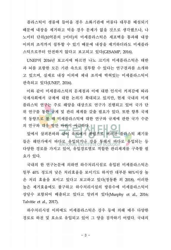3 플라스틱이 생물에 들어올 경우 소화기관에 머물다 대부분 배설되기 때문에 내장을 제거하고 먹을 경우 문제가 없을 것으로 생각했으나, 나 노미터 단위 10억분의 1미터 의 미세플라스틱은 세포벽을 통과해 내장 이외의 조직까지 침투할 수 있기 때문에 내장을 제거하더라도 미세플라 스틱으로부터 안전하지 않다고 보고되고 있다??P, 2016 UNEP의 2016년 보고서에 따르면 나노 크기의 미세플라스틱은 태반 과 뇌를 포함한 모든 기관 속으로 침투할 수 있다는 연구결과를 소개하 고 있으며, 실제로 내장 이외에 체내 조직에 박혀있는 미세플라스틱이 관측되고 있다 UNEP, 2016 이와 같이 미세플라스틱의 문제점과 이에 대한 인식이 커져감에 따라 국제사회에서 규제에 대한 논의가 확대되고 있지만, 현재 국내의 미세 플라스...