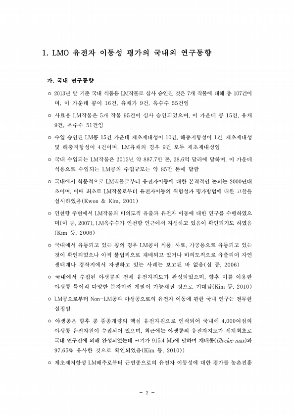 2 1. LMO 유전자 이동성 평가의 국내외 연구동향 가. 국내 연구동향 ㅇ 2013년 말 기준 국내 식품용 LM작물로 심사 승인된 것은 7개 작물에 대해 총 107건이 며, 이 가운데 콩이 16건, 유채가 9건, 옥수수 55건임 ㅇ 사료용 LM작물은 5개 작물 95건이 심사 승인되었으며, 이 가운데 콩 15건, 유채 9건, 옥수수 51건임 ㅇ 수입 승인된 LM콩 15건 가운데 제초제내성이 10건, 해충저항성이 1건, 제초제내성 및 해충저항성이 4건이며, LM유채의 경우 9건 모두 제초제내성임 ㅇ 국내 수입되는 LM작물은 2013년 약 887.7만 톤, 28.6억 달러에 달하며, 이 가운데 식용으로 수입되는 LM콩의 수입규모는 약 85만 톤에 달함 ㅇ 국내에서 학문적으로 LM작물로부터 유전자이동에 대한 본격...
