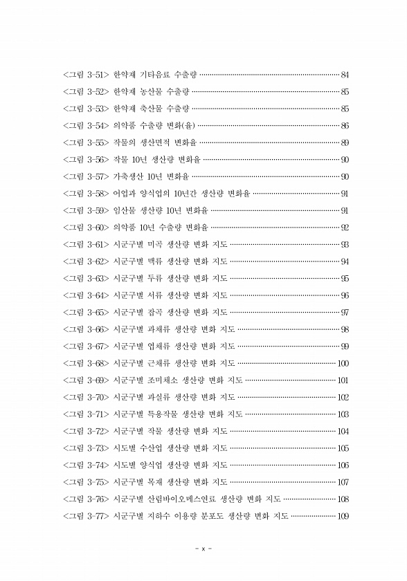 x 그림 3-51 한약재 기타음료 수출량 ···································································· 84 그림 3-52 한약재 농산물 수출량 ········································································85 그림 3-53 한약재 축산물 수출량 ········································································85 그림 3-54 의약품 수출량 변화 율 ·····································································86 그림 3-55 작물의 생산면적 변화율 ·...