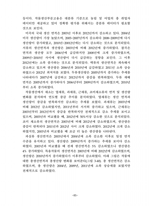 -85- 등이다 작물생산부문고용은 대분류 기준으로 농림 및 어업의 총 취업자 데이터만 제공하고 있어 정확한 평가를 위해서는 중분류 데이터가 필요할 것으로 보인다 미곡의 국내 생산 면적은 년 이후로 년까지 감소하고 있다 년 미곡 생산량이 가장 높았으며 년까지 감소하다 년에 다시 생산량이 증가하였고 년 년에는 다시 감소하는 것으로 분석되었다 서류의 생산면적과 생산량은 년에 비해 년에 증가하였다 잡곡은 면적과 생산량 모두 년에 급감하지만 년에 크게 증가하였으며 년 년 사이에 생산량이 다시 급감하는 경향을 보인다 그 이후 년에는 소폭 증가하는 것으로 분석되었다 맥류의 생산면적은 계속해서 감소하고 있으며 생산량은 년과 년에 급감하였고 년 소폭 상승 하였으나 년 최저치를 보였다 두류생산량은 년까지 증가하는 추세를 나타...