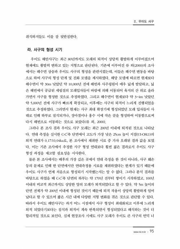 Ⅱ. 우이도 사구 www.nie.re.kr ? 95 취식와지들도 이를 잘 뒷받침한다. 라. 사구의 형성 시기 우이도 해안사구는 최근 80년까지도 모래의 퇴적이 상당히 활발하게 이루어졌으며 현재에도 활발히 변하고 있는 지형으로 판단된다. 기존에 이루어진 류 외 2000 의 조사 에서는 해수면 상승과 우이도 사구의 형성을 관련시켰는데, 이들은 해수면 변동을 바탕 으로 하여 사구의 형성 단계 및 진화 모델을 제시하였다. 해당 모델에 따르면 현재보다 해수면이 약 30m 낮았던 약 10,000년 전에 해빈과 사주평원이 매우 넓게 발달하고, 넓 은 해빈에서 공급된 세립질의 모래입자들이 바람에 의해 이동되어 육지의 산 위로 올라 가면서 사구를 형성한 것으로 추정하였다. 그리고 해수면이 현재보다 약 34m 낮았던 약 5,...