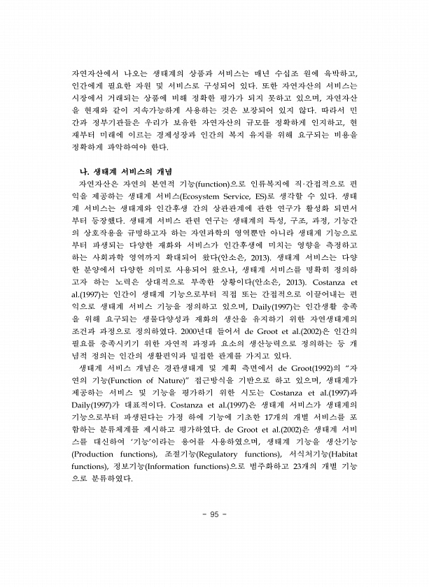 95 자연자산에서 나오는 생태계의 상품과 서비스는 매년 수십조 원에 육박하고 인간에게 필요한 자원 및 서비스로 구성되어 있다 또한 자연자산의 서비스는 시장에서 거래되는 상품에 비해 정확한 평가가 되지 못하고 있으며 자연자산 을 현재와 같이 지속가능하게 사용하는 것은 보장되어 있지 않다 따라서 민 간과 정부기관들은 우리가 보유한 자연자산의 규모를 정확하게 인지하고 현 재부터 미래에 이르는 경제성장과 인간의 복지 유지를 위해 요구되는 비용을 정확하게 파악하여야 한다 나 생태계 서비스의 개념 자연자산은 자연의 본연적 기능 으로 인류복지에 직 간접적으로 편 익을 제공하는 생태계 서비스 로 생각할 수 있다 생태 계 서비스는 생태계와 인간후생 간의 상관관계에 관한 연구가 활성화 되면서 부터 등장했다 생태계 서비스 관련...