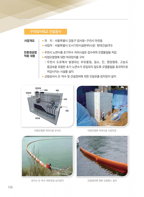 106 사업개요 구리암사대교 건설공사 ● 위 치 서울특별시 강동구 암사동구리시 아천동 ● 사업자 서울특별시 도시기반시설본부 시공현대건설 주 ● 우천시 노면수를 초기우수 처리시설로 집수하여 오염물질을 저감 ● 비점오염원에 대한 여과장치를 구비 우천시 도로에서 발생되는 부유물질, 질소, 인, 영양염류, 고농도 중금속을 포함한 초기 노면수가 유입되지 않도록 오염물질을 효과적으로 저감시키는 시설물 설치 ● 교량공사시 오·탁수 및 건설장비에 의한 오일유출 방지장치 설치 친환경공법 적용 내용 비점오염원 처리시설 모식도 비점오염원 처리시설 시공전경 공사시 오·탁수 하류유입 상시방지 건설장비에 대한 오일펜스설치