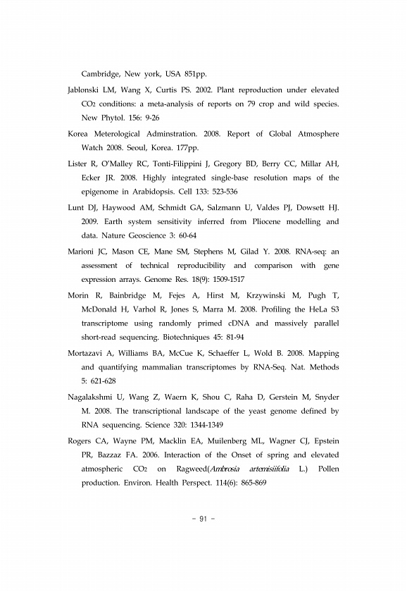 91 Cambridge, New york, USA 851pp. Jablonski LM, Wang X, Curtis PS. 2002. Plant reproduction under elevated CO2 conditionsa meta-analysis of reports on 79 crop and wild species. New Phytol. 1569-26 Korea Meterological Adminstration. 2008. Report of Global Atmosphere Watch 2008. Seoul, Korea. 177pp. Lister R, OMalley RC, Tonti-Filippini J, Gregory BD, Berry CC, Millar AH, Ecker JR. 2008. Highly int...