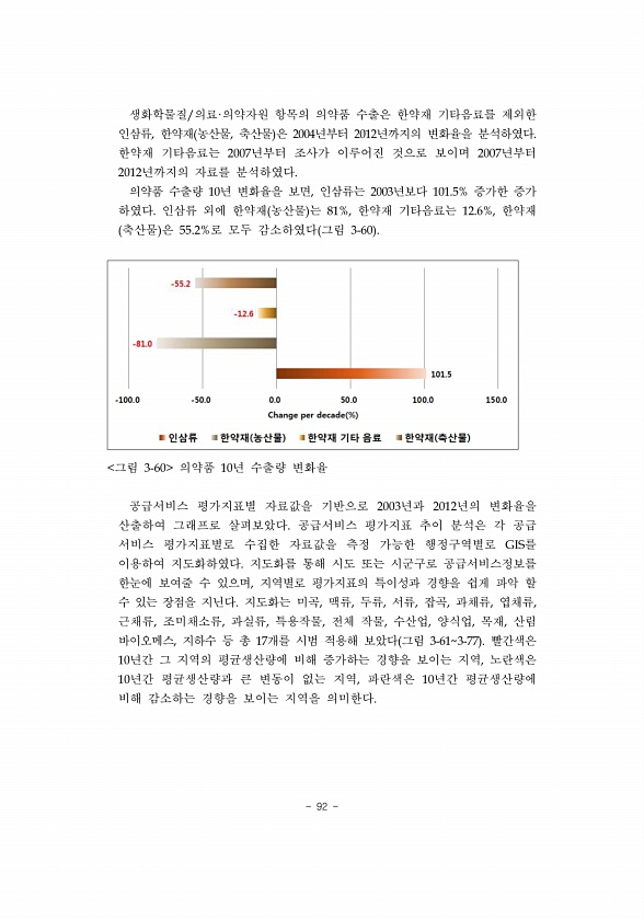 92 생화학물질/의료·의약자원 항목의 의약품 수출은 한약재 기타음료를 제외한 인삼류, 한약재 농산물, 축산물 은 2004년부터 2012년까지의 변화율을 분석하였다. 한약재 기타음료는 2007년부터 조사가 이루어진 것으로 보이며 2007년부터 2012년까지의 자료를 분석하였다. 의약품 수출량 10년 변화율을 보면, 인삼류는 2003년보다 101.5% 증가한 증가 하였다. 인삼류 외에 한약재 농산물 는 81%, 한약재 기타음료는 12.6%, 한약재 축산물 은 55.2%로 모두 감소하였다 그림 3-60 그림 3-60 의약품 10년 수출량 변화율 공급서비스 평가지표별 자료값을 기반으로 2003년과 2012년의 변화율을 산출하여 그래프로 살펴보았다. 공급서비스 평가지표 추이 분석은 각 공급 서비스 평가지표별로 수집한...