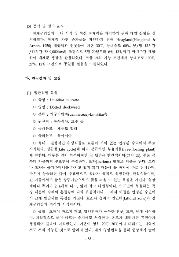 88 5 증식 및 생리 조사 점개구리밥의 국내 서식 및 확산 잠재력을 파악하기 위해 배양 실험을 실 시하였다. 잠재적 자연 증가율을 확인하기 위해 Hoagland Hoagland & Arnon, 1950 배양액과 연못물에 기온 30℃, 상대습도 60%, 낮/밤 13시간 /11시간 약 9,000lux의 조건으로 5월 20일부터 6월 13일까지 약 3주간 배양 하여 개체군 생장을 관찰하였다. 또한 야외 기상 조건에서 상대조도 100%, 27%, 12% 조건으로 동일한 실험을 수행하였다. 다. 연구결과 및 고찰 1 일반적인 특성 ○ 학명 Landoltia punctata ○ 영명 Dotted duckweed ○ 분류 개구리밥과 Lemnaceae -Landoltia속 ○ 원산지 북아시아, 호주 등 ○ 국내분포 제주...