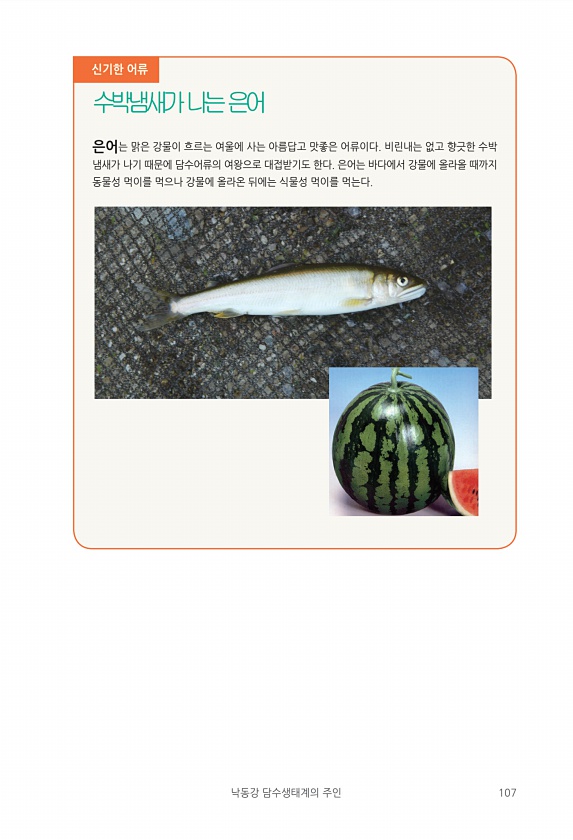 낙동강 담수생태계의 주인 107 신기한 어류 은어는 맑은 강물이 흐르는 여울에 사는 아름답고 맛좋은 어류이다. 비린내는 없고 향긋한 수박 냄새가 나기 때문에 담수어류의 여왕으로 대접받기도 한다. 은어는 바다에서 강물에 올라올 때까지 동물성 먹이를 먹으나 강물에 올라온 뒤에는 식물성 먹이를 먹는다. 수박냄새가 나는은어