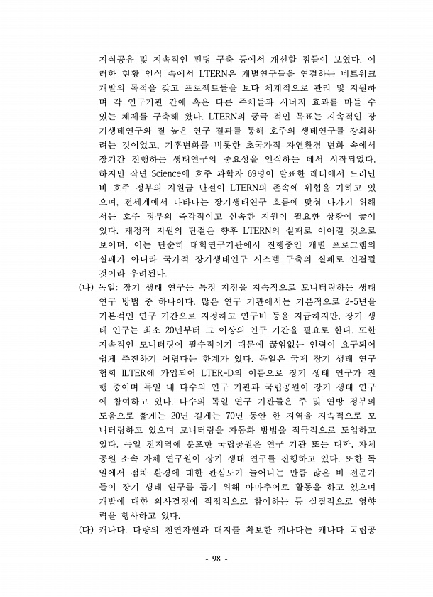98 지식공유 및 지속적인 펀딩 구축 등에서 개선할 점들이 보였다. 이 러한 현황 인식 속에서 LTERN은 개별연구들을 연결하는 네트워크 개발의 목적을 갖고 프로젝트들을 보다 체계적으로 관리 및 지원하 며 각 연구기관 간에 혹은 다른 주체들과 시너지 효과를 마들 수 있는 체제를 구축해 왔다. LTERN의 궁극 적인 목표는 지속적인 장 기생태연구와 질 높은 연구 결과를 통해 호주의 생태연구를 강화하 려는 것이었고, 기후변화를 비롯한 초국가적 자연환경 변화 속에서 장기간 진행하는 생태연구의 중요성을 인식하는 데서 시작되었다. 하지만 작년 Science에 호주 과학자 69명이 발표한 레터에서 드러난 바 호주 정부의 지원금 단절이 LTERN의 존속에 위협을 가하고 있 으며, 전세계에서 나타나는 장기생태연구 흐름에 ...