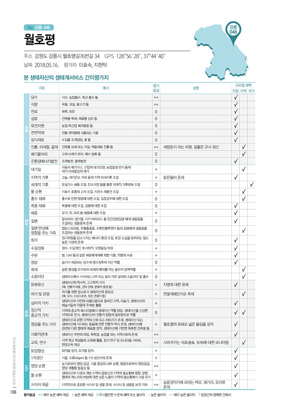 No. 강릉- 강릉 048 본 생태자산의 생태계서비스 간이평가지 구분 예시 평가 등급 설명 규모별 혜택 지점 지역 국가 공급 담수 식수, 농업용수, 축산 용수 등 ++ √ 식량 곡물, 과실, 물고기 등 ++ √ 연료 화목, 토탄 0 √ 섬유 건축용 목재, 의류용 섬유 등 0 √ 유전자원 농업·축산업 희귀품종 등 0 √ 천연약재 전통 의약품에 사용되는 식물 0 √ 장식재료 수집용 조개껍질, 꽃 등 0 √ 진흙, 미네랄, 골재 건축용 모래 또는 자갈, 벽돌재료 진흙 등 ++ 새창둔지 라는 어원, 질좋은 규사 생산 √ 폐기물처리 고체 쓰레기 하치, 폐수 방류 등 0 √ 친환경에너지발전 조력발전, 풍력발전 0 √ 조절 대기질 자동차 배기가스, 산업체 대기오염, 농업발생 먼지 등의 대기 미세물질의 제거 + √ 지역적...