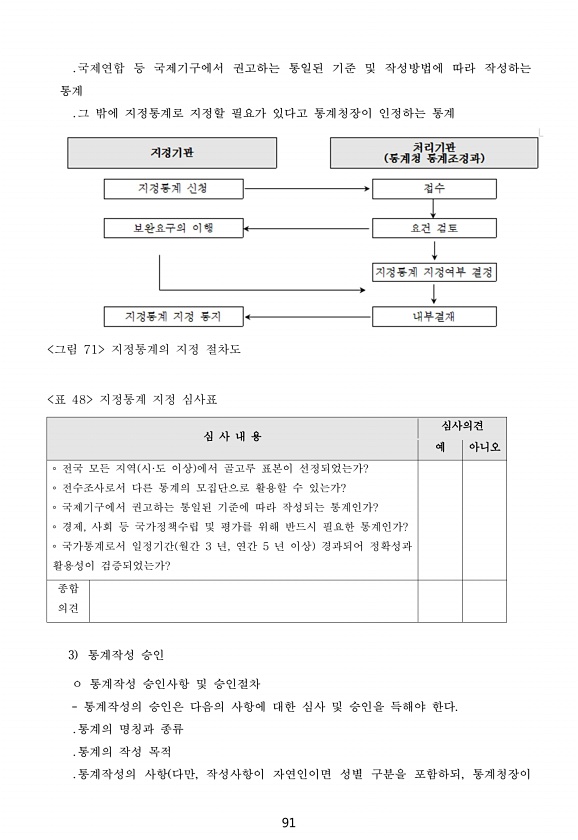91 ?국제연합 등 국제기구에서 권고하는 통일된 기준 및 작성방법에 따라 작성하는 통계 ?그 밖에 지정통계로 지정할 필요가 있다고 통계청장이 인정하는 통계 그림 71 지정통계의 지정 절차도 표 48 지정통계 지정 심사표 심 사 내 용 심사의견 예 아니오 ? 전국 모든 지역 시·도 이상 에서 골고루 표본이 선정되었는가? ? 전수조사로서 다른 통계의 모집단으로 활용할 수 있는가? ? 국제기구에서 권고하는 통일된 기준에 따라 작성되는 통계인가? ? 경제, 사회 등 국가정책수립 및 평가를 위해 반드시 필요한 통계인가? ? 국가통계로서 일정기간 월간 3 년, 연간 5 년 이상 경과되어 정확성과 활용성이 검증되었는가? 종합 의견 3 통계작성 승인 ㅇ 통계작성 승인사항 및 승인절차 통계작성의 승인은 다음의 사항에 대한 ...