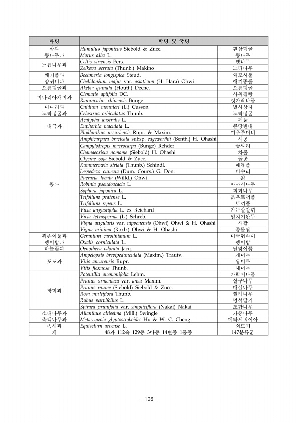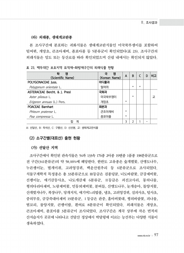 Ⅱ. 조사결과 www.nie.re.kr ? 97 라 외래종, 생태계교란종 본 조사구간에 분포하는 귀화식물은 생태계교란식물인 미국쑥부쟁이를 포함하여 털여뀌, 개망초, 큰조아재비, 좀포아풀 등 5분류군이 확인되었다 표 23 조사구간의 외래식물은 임도 또는 등산로를 따라 확인되었으며 산림 내에서는 확인되지 않았다. 표 23. 백두대간 보호지역 묘적재화방재구간의 외래식물 현황 학 명 Scientific Name 국 명 Korean Name A B C D 비고 POLYGONACEAE Juss. 마디풀과 Polygonum orientale L. 털여뀌 * * ASTERACEAE Bercht. & J. Presl 국화과 Aster pilosus L. 미국쑥부쟁이 * 교 Erigeron annuas L. Pers. 개망초...