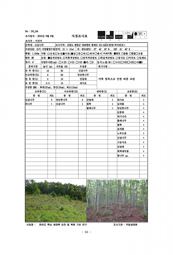 94 No DG_N4 조사일자 2015년 9월 8일 조사자 이선미 식생조사표 군락명신갈나무 조사지역강원도 평창군 대관령면 횡계리 산1-122도엽명 격자번호 식생상관산지 낙엽활엽수림면적15 × 15㎡ 위·경도 GPS 37° 45′ 22″N , 128° 41′ 45″E 해발1,020m 지형□산정□능선■사면 ■상□중□하 □계곡□평지 미세지형■평면 □돌출 □함몰□요철 방위SW 토양■갈색삼림토 □적황색삼림토 □암적색삼림토 □회갈색삼림토 □침식토 □미숙토 □암쇄토 경사4° 낙엽부식층 cm □≥20 □ 15 □ 10 ■ 5 □0 암석노 출 % □≥51□ 50□ 25□ 5■0 층위구분 높이 m 식피율 % 우점종 특기사항 교 목 층 T1 12 95 신갈나무 가축 방목으로 인한 하층 교란 아교목층 T2 9 60 당단풍나무 관...