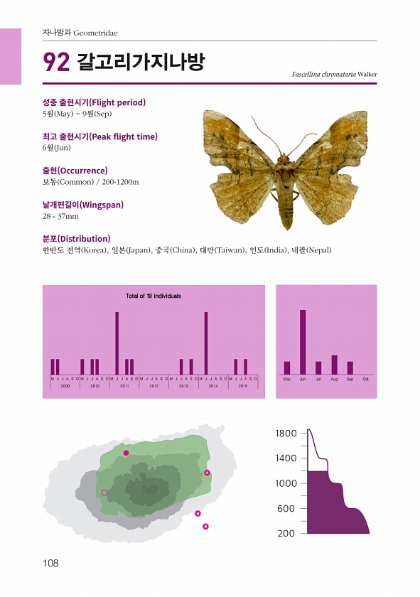 108 자나방과 Geometridae 성충 출현시기 Flight period 5월 May 9월 Sep 최고 출현시기 Peak fight time 6월 Jun 출현 Occurrence 보통 Common 200-1200m 날개편길이 Wingspan 28 37mm 분포 Distribution 한반도 전역 Korea , 일본 Japan , 중국 China , 대만 Taiwan , 인도 India , 네팔 Nepal Fascellina chromataria Walker M J J A S O M J J A S O M J J A S O M J J A S O M J J A S O M J J A S O M J J A S O May Jun Jul Aug Sep Oct 2009 2010 2011 2012 2013 2014 20...
