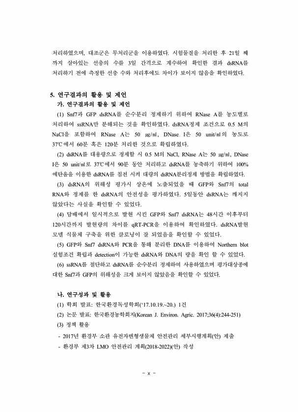 x 처리하였으며, 대조군은 무처리군을 이용하였다. 시험물질을 처리한 후 21일 째 까지 살아있는 선충의 수를 3일 간격으로 계수하여 확인한 결과 dsRNA를 처리하기 전에 측정한 선충 수와 처리후에도 차이가 보이지 않음을 확인하였다. 5. 연구결과의 활용 및 제언 가. 연구결과의 활용 및 제언 1 Snf7과 GFP dsRNA를 순수분리 정제하기 위하여 RNase A를 농도별로 처리하여 ssRNA만 분해되는 것을 확인하였다. dsRNA정제 조건으로 0.5 M의 NaCl을 포함하여 RNase A는 50 ㎍/㎖, DNase I은 50 unit/㎖의 농도로 37℃ 에서 60분 혹은 120분 처리한 것으로 확립하였다. 2 dsRNA를 대용량으로 정제할 시 0.5 M의 NaCl, RNase A는 50 ㎍/㎖, DNas...