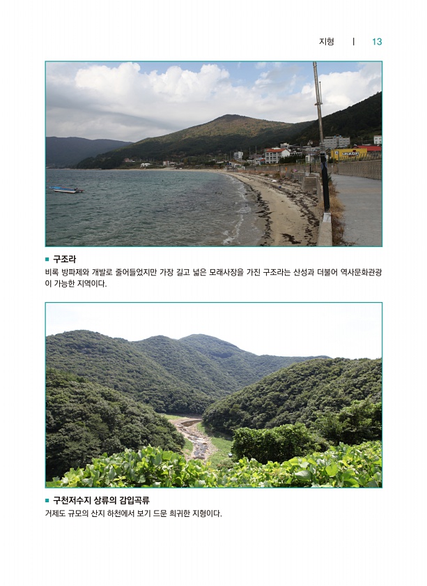 지형 ┃ 13 ■ 구조라 비록 방파제와 개발로 줄어들었지만 가장 길고 넓은 모래사장을 가진 구조라는 산성과 더불어 역사문화관광 이 가능한 지역이다. ■ 구천저수지 상류의 감입곡류 거제도 규모의 산지 하천에서 보기 드문 희귀한지형이다.
