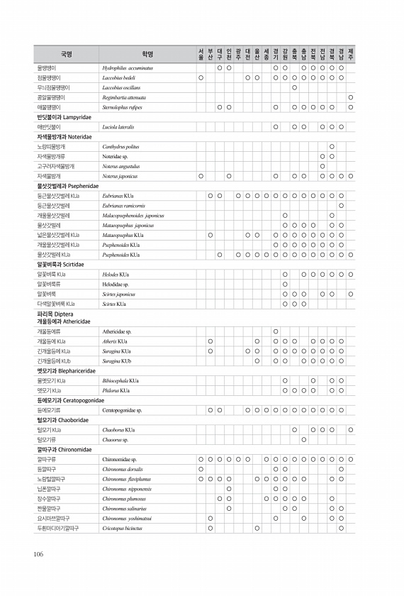 106 물땡땡이 Hydrophilus accuminatus ○ ○ ○ ○ ○ ○ ○ ○ ○ 점물땡땡이 Laccobius bedeli ○ ○ ○ ○ ○ ○ ○ ○ ○ ○ ○ 무늬점물땡땡이 Laccobius oscillans ○ 콩알물땡땡이 Regimbartia attenuata ○ 애물땡땡이 Sternolophus rufpes ○ ○ ○ ○ ○ ○ ○ ○ ○ 반딧불이과 Lampyridae 애반딧불이 Luciola lateralis ○ ○ ○ ○ ○ ○ 자색물방개과 Noteridae 노랑띠물방개 Canthydrus politus ○ 자색물방개류 Noteridae sp. ○ ○ 고구려자색물방개 Noterus angustulus ○ 자색물방개 Noterus japonicus ○ ○ ○ ○ ○ ○ ○ ○ ○ 물삿갓벌...