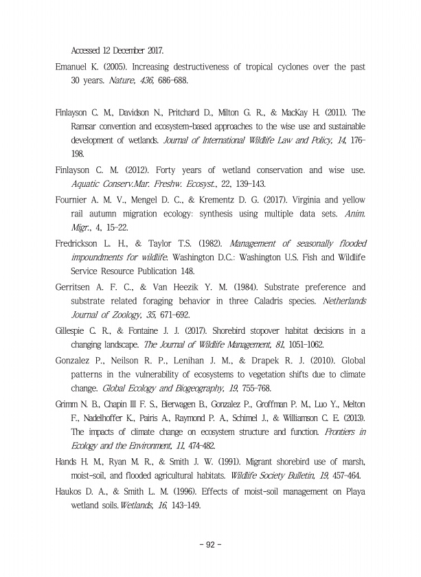 92 Accessed 12 December 2017. Emanuel K. 2005 Increasing destructiveness of tropical cyclones over the past 30 years. Nature, 436, 686?688. Finlayson C. M., Davidson N., Pritchard D., Milton G. R., & MacKay H. 2011 The Ramsar convention and ecosystem-based approaches to the wise use and sustainable development of wetlands. Journal of International Wildlife Law and Policy, 14, 176? 198. Finlayson C...