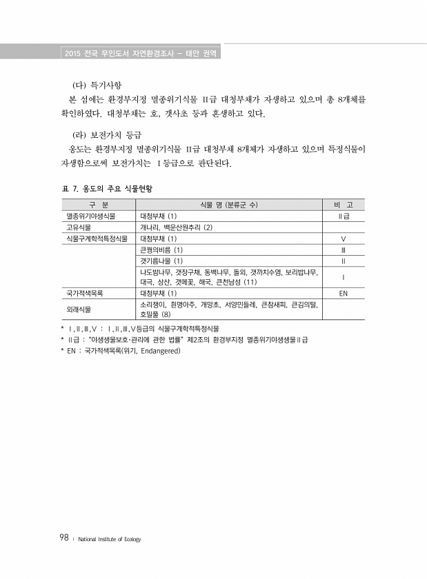 2015 전국 무인도서 자연환경조사 태안 권역 98 ? National Institute of Ecology 다 특기사항 본 섬에는 환경부지정 멸종위기식물 Ⅱ급 대청부채가 자생하고 있으며 총 8개체를 확인하였다. 대청부채는 호, 갯사초 등과 혼생하고 있다. 라 보전가치 등급 옹도는 환경부지정 멸종위기식물 Ⅱ급 대청부채 8개체가 자생하고 있으며 특정식물이 자생함으로써 보전가치는 Ⅰ등급으로 판단된다. 구 분 식물 명 분류군 수 비 고 멸종위기야생식물 대청부채 1 Ⅱ급 고유식물 개나리, 백운산원추리 2 식물구계학적특정식물 대청부채 1 Ⅴ 큰꿩의비름 1 Ⅲ 갯기름나물 1 Ⅱ 나도밤나무, 갯장구채, 동백나무, 돌외, 갯까치수염, 보리밥나무, 대극, 상산, 갯메꽃, 해국, 큰천남성 11 Ⅰ 국가적색목록 대청부채 1 E...