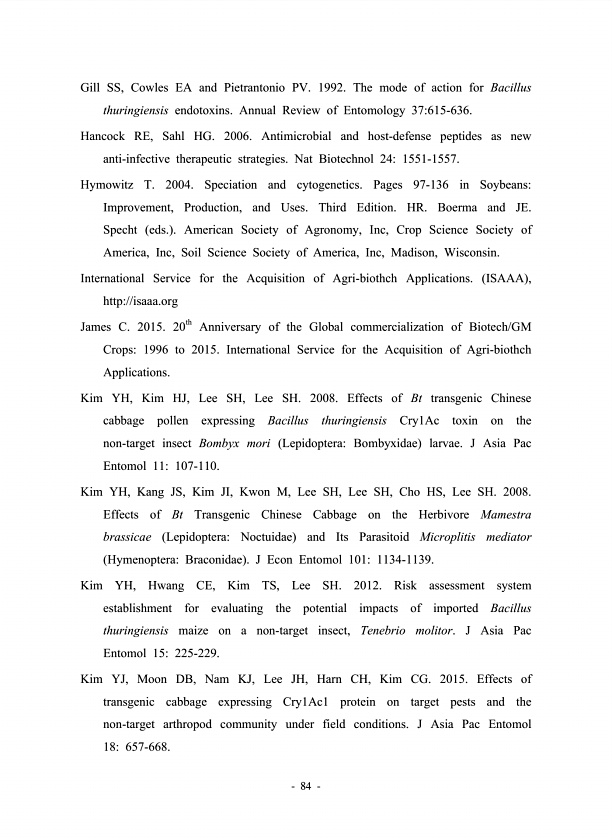 84 Gill SS, Cowles EA and Pietrantonio PV. 1992. The mode of action for Bacillus thuringiensis endotoxins. Annual Review of Entomology 37615-636. Hancock RE, Sahl HG. 2006. Antimicrobial and host-defense peptides as new anti-infective therapeutic strategies. Nat Biotechnol 241551-1557. Hymowitz T. 2004. Speciation and cytogenetics. Pages 97-136 in SoybeansImprovement, Production, and Uses. Third E...
