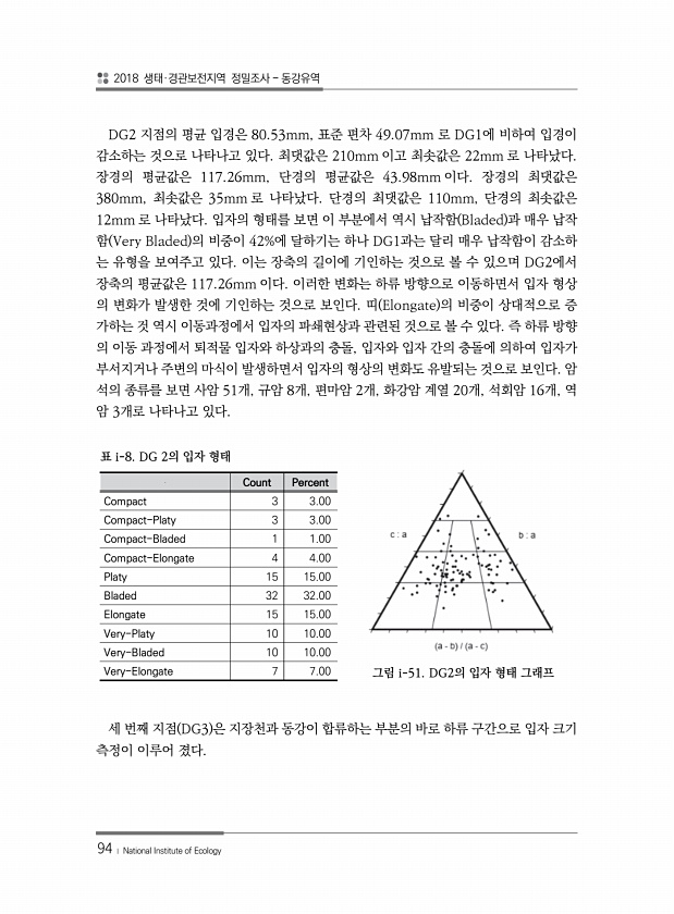 2018 생태·경관보전지역 정밀조사 동강유역 94 ? National Institute of Ecology DG2 지점의 평균 입경은 80.53mm, 표준 편차 49.07mm 로 DG1에 비하여 입경이 감소하는 것으로 나타나고 있다. 최댓값은 210mm 이고 최솟값은 22mm 로 나타났다. 장경의 평균값은 117.26mm, 단경의 평균값은 43.98mm 이다. 장경의 최댓값은 380mm, 최솟값은 35mm 로 나타났다. 단경의 최댓값은 110mm, 단경의 최솟값은 12mm 로 나타났다. 입자의 형태를 보면 이 부분에서 역시 납작함 Bladed 과 매우 납작 함 Very Bladed 의 비중이 42%에 달하기는 하나 DG1과는 달리 매우 납작함이 감소하 는 유형을 보여주고 있다. 이는 장축의 길이에 기인하는 ...