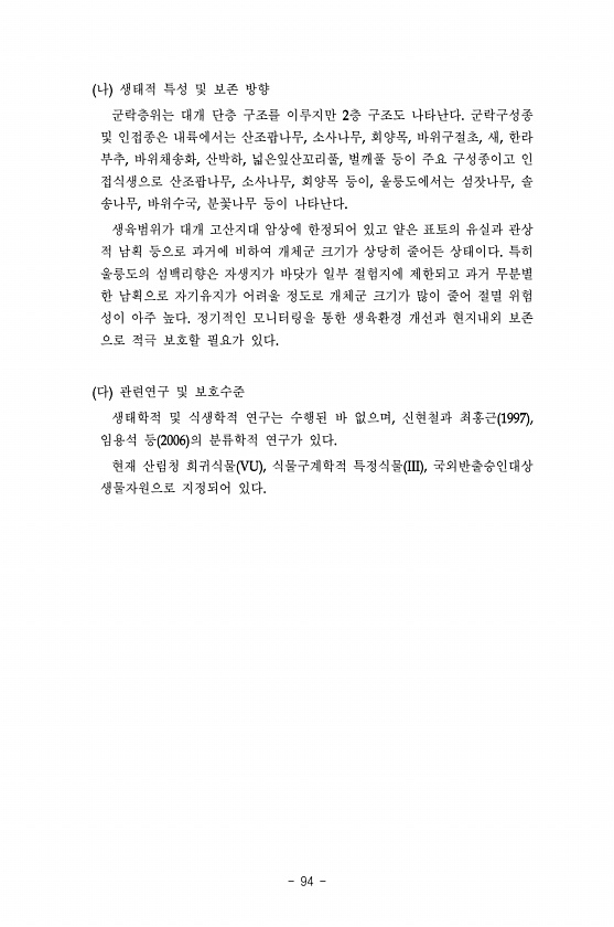 94 나 생태적 특성 및 보존 방향 군락층위는 대개 단층 구조를 이루지만 층 구조도 나타난다 군락구성종 및 인접종은 내륙에서는 산조팝나무 소사나무 회양목 바위구절초 새 한라 부추 바위채송화 산박하 넓은잎산꼬리풀 벌깨풀 등이 주요 구성종이고 인 접식생으로 산조팝나무 소사나무 회양목 등이 울릉도에서는 섬잣나무 솔 송나무 바위수국 분꽃나무 등이 나타난다 생육범위가 대개 고산지대 암상에 한정되어 있고 얕은 표토의 유실과 관상 적 남획 등으로 과거에 비하여 개체군 크기가 상당히 줄어든 상태이다 특히 울릉도의 섬백리향은 자생지가 바닷가 일부 절험지에 제한되고 과거 무분별 한 남획으로 자기유지가 어려울 정도로 개체군 크기가 많이 줄어 절멸 위험 성이 아주 높다 정기적인 모니터링을 통한 생육환경 개선과 현지내외 보존 으로...