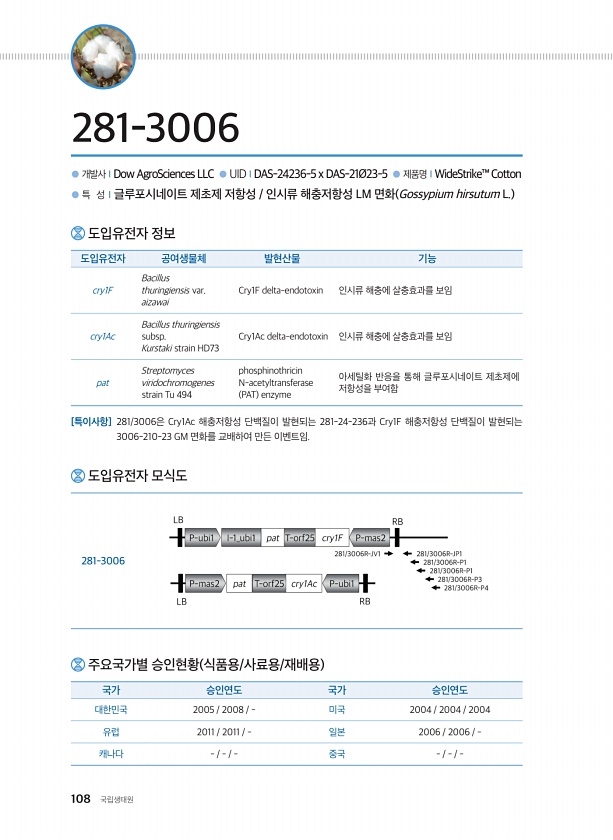 108 국립생태원 281-3006 주요국가별 승인현황 식품용/사료용/재배용 국가 승인연도 국가 승인연도 대한민국 2005 2008 미국 2004 2004 2004 유럽 2011 2011 일본 2006 2006 캐나다 중국 도입유전자 모식도 281-3006 ● 개발사ⅠDow AgroSciences LLC ● UIDⅠDAS-24236-5 x DAS-21Ø23-5 ● 제품명ⅠWideStrike™ Cotton ● 특 성Ⅰ글루포시네이트 제초제 저항성 인시류 해충저항성 LM 면화 Gossypium hirsutum L. 도입유전자 정보 도입유전자 공여생물체 발현산물 기능 cry1F Bacillus thuringiensis var. aizawai Cry1F delta-endotoxin 인시류 해충에 살충효과를 보임 cry...