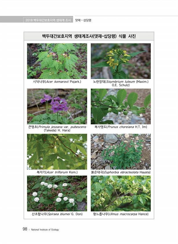 2018 백두대간보호지역 생태계 조사 댓재 삽당령 98 ? National Institute of Ecology 백두대간보호지역 생태계조사 댓재삽당령 식물 사진 시닥나무 Acer komarovii Pojark. 노란장대 Sisymbrium luteum Maxim. O.E. Schulz 큰앵초 Primula jesoana var. pubescens Takeda H. Hara 복사앵도 Prunus choreiana H.T. Im 복자기 Acer triflorum Kom. 붉은대극 Euphorbia ebracteolata Hayata 산조팝나무 Spiraea blumei G. Don 왕느릅나무 Ulmus macrocarpa Hance