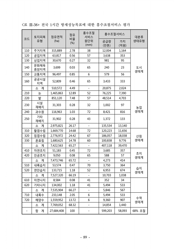 코드 토지피복 유형 점유면적 ha 점유 비율 % 홍수조절 서비스 원단위 mm 홍수조절서비스 대분류 공급량 생태유형 만톤 가치 억원 110 주거지역 315,889 2.78 38 12,004 1,164 도시 생태계 120 공업지역 63,817 0.56 57 3,638 353 130 상업지역 30,670 0.27 32 981 95 140 문화체육 휴양지역 3,699 0.03 65 240 23 150 교통지역 96,497 0.85 6 579 56 160 공공시설 지역 52,809 0.46 65 3,433 333 소 계 510,572 4.49 20,875 2,024 210 논 1,465,863 12.89 52 76,225 7,390 농업 생태계 220 밭 851,120 7.48 57 48,514 4,703 230 시...