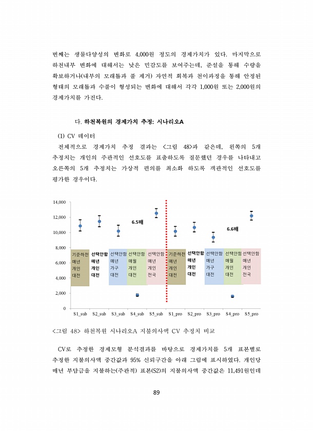 89 번째는 생물다양성의 변화로 4,000원 정도의 경제가치가 있다. 마지막으로 하천내부 변화에 대해서는 낮은 민감도를 보여주는데, 준설을 통해 수량을 확보하거나 내부의 모래톱과 풀 제거 자연적 회복과 천이과정을 통해 안정된 형태의 모래톱과 수풀이 형성되는 변화에 대해서 각각 1,000원 또는 2,000원의 경제가치를 가진다. 하천복원의 경제가치 추정시나리오A 1 CV 데이터 전체적으로 경제가치 추정 결과는 그림 48 과 같은데, 왼쪽의 5개 추정치는 개인의 주관적인 선호도를 표출하도록 질문했던 경우를 나타내고 오른쪽의 5개 추정치는 가상적 편의를 최소화 하도록 객관적인 선호도를 평가한 경우이다. 그림 48 하천복원 시나리오A 지불의사액 CV 추정치 비교 CV로 추정한 경제모형 분석결과를 바탕으로 경제가치를...