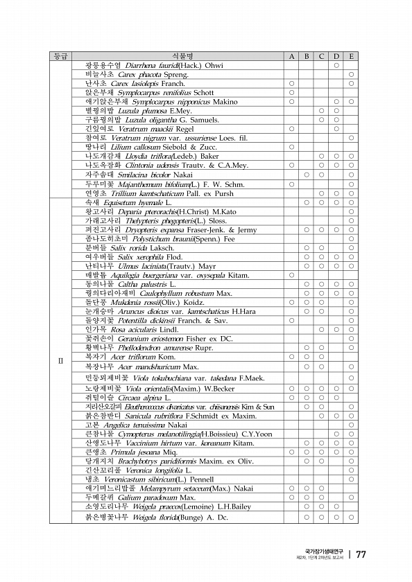 등급 식물명 광릉용수염 비늘사초 난사초 앉은부채 애기앉은부채 별꿩의밥 구름꿩의밥 긴잎여로 참여로 땅나리 나도개감채 나도옥잠화 자주솜대 두루미꽃 연영초 속새 왕고사리 가래고사리 퍼진고사리 좀나도히초미 분버들 여우버들 난티나무 매발톱 동의나물 꿩의다리아재비 돌단풍 눈개승마 돌양지꽃 인가목 꽃쥐손이 황벽나무 복자기 복장나무 민둥뫼제비꽃 노랑제비꽃 쥐털이슬 지리산오갈피 붉은참반디 고본 큰참나물 산앵도나무 큰앵초 당개지치 긴산꼬리풀 냉초 애기며느리밥풀 두메갈퀴 소영도리나무 붉은병꽃나무 국가장기생태연구 제2차, 1단계 2차년도 보고서 |77
