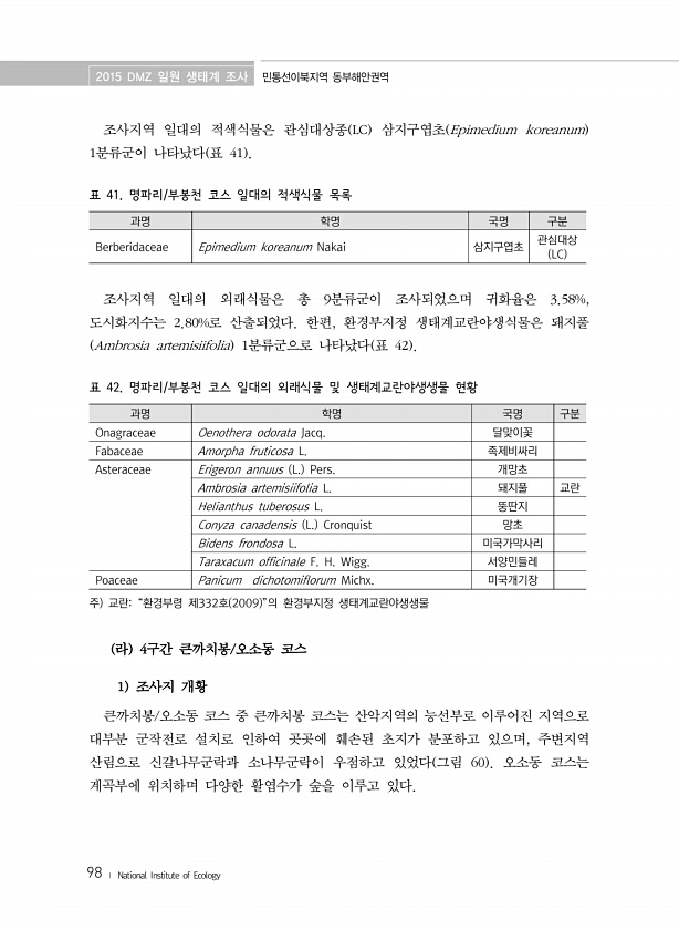 2015 DMZ 일원 생태계 조사 민통선이북지역 동부해안권역 98 ? National Institute of Ecology 조사지역 일대의 적색식물은 관심대상종 LC 삼지구엽초 Epimedium koreanum 1분류군이 나타났다 표 41 과명 학명 국명 구분 Berberidaceae Epimedium koreanum Nakai 삼지구엽초 관심대상 LC 표 41. 명파리/부봉천 코스 일대의 적색식물 목록 조사지역 일대의 외래식물은 총 9분류군이 조사되었으며 귀화율은 3.58%, 도시화지수는 2.80%로 산출되었다. 한편, 환경부지정 생태계교란야생식물은 돼지풀 Ambrosia artemisiifolia 1분류군으로 나타났다 표 42 과명 학명 국명 구분 Onagraceae Oenothera odorata Ja...