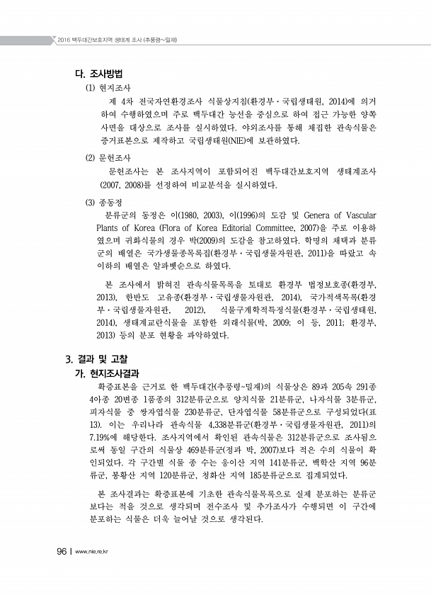 2016 백두대간보호지역 생태계 조사 추풍령밀재 96Ⅰwww.nie.re.kr 다. 조사방법 1 현지조사 제 4차 전국자연환경조사 식물상지침 환경부·국립생태원, 2014 에 의거 하여 수행하였으며 주로 백두대간 능선을 중심으로 하여 접근 가능한 양쪽 사면을 대상으로 조사를 실시하였다. 야외조사를 통해 채집한 관속식물은 증거표본으로 제작하고 국립생태원 NIE 에 보관하였다. 2 문헌조사 문헌조사는 본 조사지역이 포함되어진 백두대간보호지역 생태계조사 2007, 2008 를 선정하여 비교분석을 실시하였다. 3 종동정 분류군의 동정은 이 1980, 2003 , 이 1996 의 도감 및 Genera of Vascular Plants of Korea Flora of Korea Editorial Committee, 20...