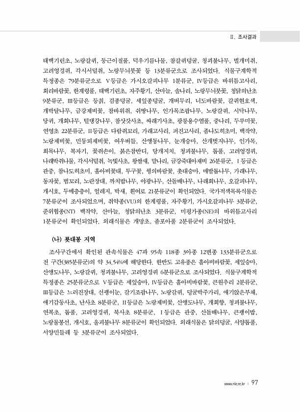 Ⅱ. 조사결과 www.nie.re.kr ? 97 태백기린초, 노랑갈퀴, 둥근이질풀, 덕우기름나물, 참갈퀴덩굴, 청괴불나무, 벌개미취, 고려엉겅퀴, 각시서덜취, 노랑무늬붓꽃 등 13분류군으로 조사되었다. 식물구계학적 특정종은 79분류군으로 Ⅴ등급은 가시오갈피나무 1분류군, Ⅳ등급은 바위틈고사리, 회리바람꽃, 한계령풀, 태백기린초, 자주황기, 산마늘, 솔나리, 노랑무늬붓꽃, 청닭의난초 9분류군, Ⅲ등급은 등칡, 검종덩굴, 세잎종덩굴, 개버무리, 너도바람꽃, 갈퀴현호색, 개박달나무, 금강제비꽃, 참바위취, 쉬땅나무, 인가목조팝나무, 노랑갈퀴, 시닥나무, 당귀, 개회나무, 털댕강나무, 참삿갓사초, 싸래기사초, 광릉용수염풀, 중나리, 두루미꽃, 연영초 22분류군, Ⅱ등급은 다람쥐꼬리, 가래고사리, 퍼진고사리, 좀나도...