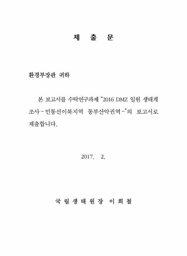 제 출 문 환경부장관 귀하 본 보고서를 수탁연구과제 “2016 DMZ 일원 생태계 조사 ? 민통선이북지역 동부산악권역 ?”의 보고서로 제출합니다. 2017. 2. 국 립 생 태 원 장 이 희철