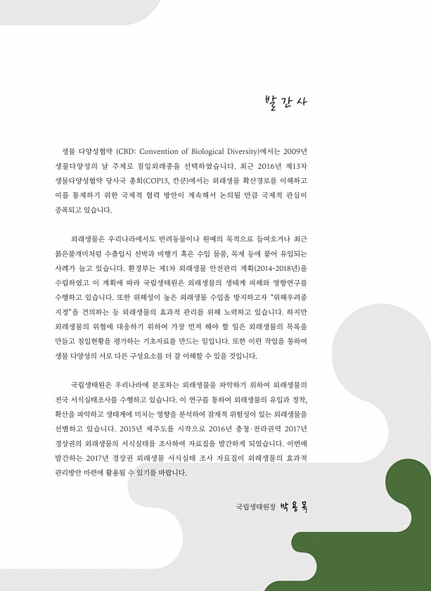 생물 다양성협약 CBDConvention of Biological Diversity 에서는 2009년 생물다양성의 날 주제로 침입외래종을 선택하였습니다. 최근 2016년 제13차 생물다양성협약 당사국 총회 COP13, 칸쿤 에서는 외래생물 확산경로를 이해하고 이를 통제하기 위한 국제적 협력 방안이 계속해서 논의될 만큼 국제적 관심이 증폭되고 있습니다. 외래생물은 우리나라에서도 반려동물이나 원예의 목적으로 들여오거나 최근 붉은불개미처럼 수출입시 선박과 비행기 혹은 수입 물품, 목재 등에 붙어 유입되는 사례가 늘고 있습니다. 환경부는 제1차 외래생물 안전관리 계획 2014-2018년 을 수립하였고 이 계획에 따라 국립생태원은 외래생물의 생태계 피해와 영향연구를 수행하고 있습니다. 또한 위해성이 높은 외래생물 수...