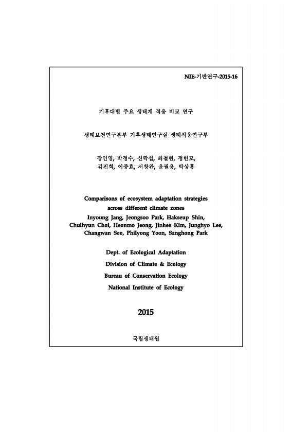 기반연구 기후대별 주요 생태계 적응 비교 연구 생태보전연구본부 기후생태연구실 생태적응연구부 장인영 박정수 신학섭 최철현 정헌모 김진희 이중효 서창완 윤필용 박상홍국립생태원