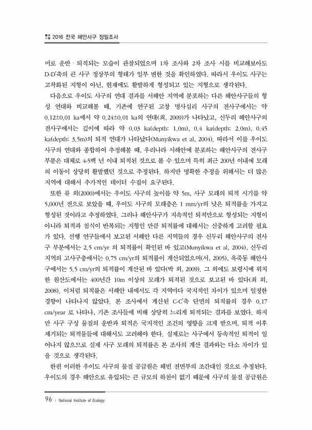 2016 전국 해안사구 정밀조사 96 ? National Institute of Ecology 머로 운반?퇴적되는 모습이 관찰되었으며 1차 조사와 2차 조사 시를 비교해보아도 D-D’축의 큰 사구 정상부의 형태가 일부 변한 것을 확인하였다. 따라서 우이도 사구는 고착화된 지형이 아닌, 현재에도 활발하게 형성되고 있는 지형으로 생각된다. 다음으로 우이도 사구의 연대 결과를 서해안 지역에 분포하는 다른 해안사구들의 형 성 연대와 비교해볼 때, 기존에 연구된 고창 명사십리 사구의 전사구에서는 약 0.12±0.01 ka에서 약 0.24±0.01 ka의 연대 최, 2009 가 나타났고, 신두리 해안사구의 전사구에서는 깊이에 따라 약 0.03 ka depth1.0m , 0.4 ka depth2.0m , 0.45 ka ...