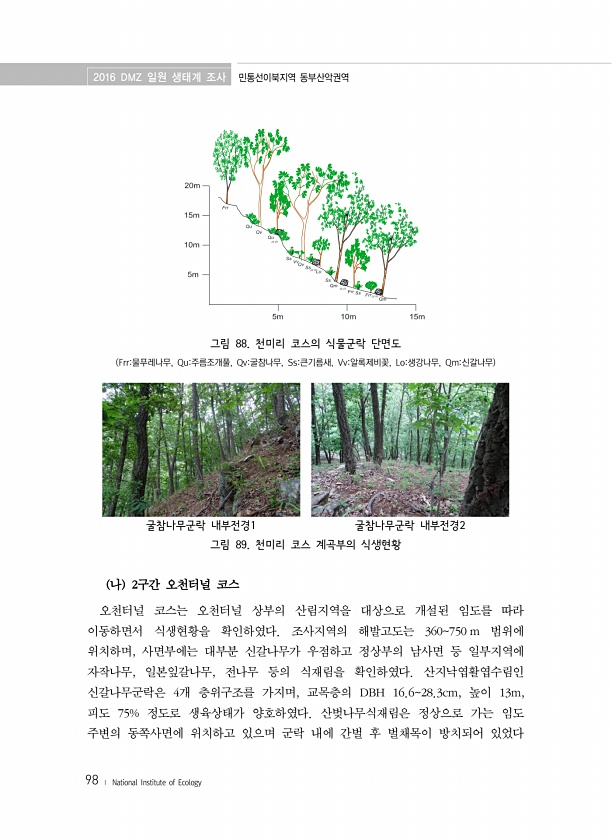 2016 DMZ 일원 생태계 조사 민통선이북지역 동부산악권역 98 ? National Institute of Ecology 그림 88. 천미리 코스의 식물군락 단면도 Frr물푸레나무, Qu주름조개풀, Qv굴참나무, Ss큰기름새, Vv알록제비꽃, Lo생강나무, Qm신갈나무 굴참나무군락 내부전경1 굴참나무군락 내부전경2 그림 89. 천미리 코스 계곡부의 식생현황 나 2구간 오천터널 코스 오천터널 코스는 오천터널 상부의 산림지역을 대상으로 개설된 임도를 따라 이동하면서 식생현황을 확인하였다. 조사지역의 해발고도는 360750 m 범위에 위치하며, 사면부에는 대부분 신갈나무가 우점하고 정상부의 남사면 등 일부지역에 자작나무, 일본잎갈나무, 전나무 등의 식재림을 확인하였다. 산지낙엽활엽수림인 신갈나무군락은 4개 층위...