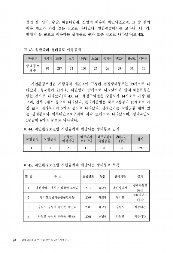 94 물인 삵 담비 수달 하늘다람쥐 산양의 이용이 확인되었으며 그 중 삵의 이용 빈도가 가장 높은 것으로 나타났다 일반종중에서는 고라니 너구리 멧돼지 등 순으로 이용하는 생태통로 수가 많은 것으로 나타났다 표 자연환경보전법 시행규칙 제 조에 규정된 법정생태통로는 개소로 나 타났다 육교형이 개소 터널형이 개소로 나타났으며 양서 파충류형은 없는 것으로 나타났다 표 행정구역별은 강원도가 개소로 가장 많 으며 전북 개소 등으로 나타났다 관리기관별은 국토교통부가 개소로 가 장 많고 전라북도가 개소 등으로 나타났다 선정근거는 국립공원 내에 있 는 생태통로와 백두대간보호구역에 각각 개소로 나타났으며 생태자연도 등급이 개소 등으로 나타났다 국립공원 도립공원 민통선 이북지역 백두대간 보호구역 백두대간 국립공원 생태자연도 등...