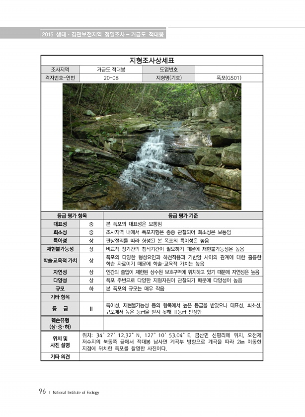 2015 생태·경관보전지역 정밀조사 거금도 적대봉 96 ? National Institute of Ecology 지형조사상세표 조사지역 거금도 적대봉 도엽번호 격자번호-연번 20-08 지형명 기호 폭포 GS01 등급 평가 항목 등급 평가 기준 대표성 중 본 폭포의 대표성은 보통임 희소성 중 조사지역 내에서 폭포지형은 종종 관찰되어 희소성은 보통임 특이성 상 판상절리를 따라 형성된 본 폭포의 특이성은 높음 재현불가능성 상 비교적 장기간의 침식기간이 필요하기 때문에 재현불가능성은 높음 학술?교육적 가치 상 폭포의 다양한 형성요인과 하천작용과 기반암 사이의 관계에 대한 훌륭한 학습 자료이기 때문에 학술·교육적 가치는 높음 자연성 상 인간의 출입이 제한된 상수원 보호구역에 위치하고 있기 때문에 자연성은 높음 다양성...