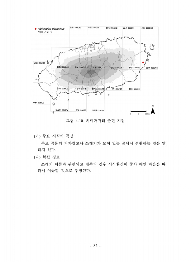 82 그림 4-10. 외미거저리 출현 지점 가 주요 서식처 특성 주로 곡물의 저자창고나 쓰레기가 모여 있는 곳에서 생활하는 것을 알 려져 있다. 나 확산 경로 쓰레기 이동과 관련되고 제주의 경우 서식환경이 좋아 해안 마을을 따 라서 이동할 것으로추정된다.