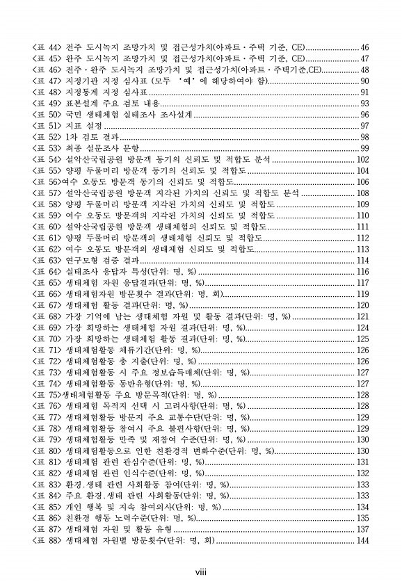 viii 표 44 전주 도시녹지 조망가치 및 접근성가치 아파트·주택 기준, CE ........................ 46 표 45 완주 도시녹지 조망가치 및 접근성가치 아파트·주택 기준, CE ........................ 47 표 46 전주·완주 도시녹지 조망가치 및 접근성가치 아파트·주택기준,CE ................. 48 표 47 지정기관 지정 심사표 모두 ‘예’에 해당하여야 함 ......................................... 90 표 48 지정통계 지정 심사표 .............................................................................................. 91 표 49...