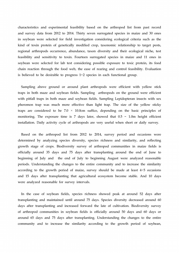 characteristics and experimental feasibility based on the arthropod list from past record and survey data from 2012 to 2014. Thirty seven surrogated species in maize and 30 ones in soybean were selected for field investigation considering ecological criteria such as the kind of toxin protein of genetically modified crop, taxonomic relationship to target pests, regional arthropods occurrence, abund...