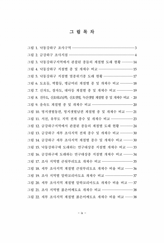 ix 그 림 목 차 그림 1. 낙동강하구 조사구역 ···········································································3 그림 2. 금강하구 조사지점 ···············································································4 그림 3. 낙동강하구지역에서 관찰된 종들의 계절별 도래 현황 ············· 14 그림 4. 낙동강하구 지점별 종 및 개체수 비교 ········································· 15 그림 5. 낙동강하구 지점별 멸종위기종 도래 현황 ··································· 17 그림 6. 도요...