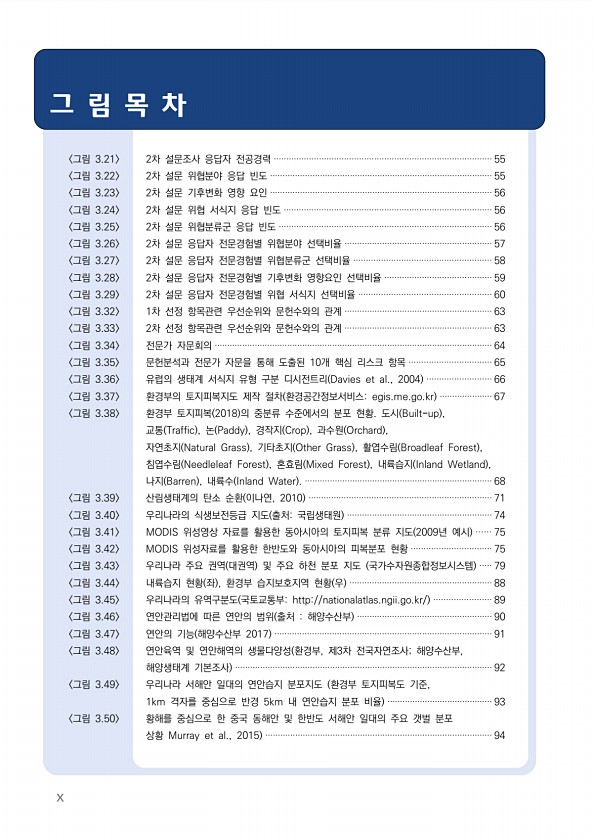 x 그 림 목 차 그림 3.21 2차 설문조사 응답자 전공경력 ······················································································· 55 그림 3.22 2차 설문 위협분야 응답 빈도 ························································································· 55 그림 3.23 2차 설문 기후변화 영향 요인 ························································································· 56 그림 3.24 2차 설문 위협 서식지 응답 빈도 ···········...